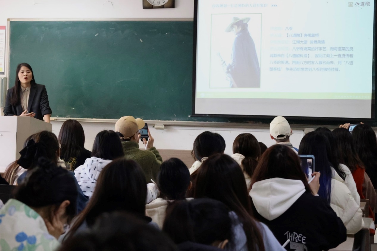 张慧灵的演讲分为两个部分,包括了在项目竞标过程中对“八道酿”料酒品牌的前后两次策划案对比分析与对“太湖雪”策划案的复盘。“八道酿”是绍兴老字号会稽山绍兴酒股份有限公司旗下子公司——浙江嘉善黄酒有限公司生产的一款谷物纯粮酿造料酒。白鲸互动针对“八道酿”新品牌实施“出圈”策略,在兼顾吸引粉丝与巩固粉丝的基础上,为品牌在线上进行全平台营销并取得了良好的宣传效果。张慧令就项目竞标过程中,根据市场需求所改动的前后两版策划案进行深度拆解分析,讲解了策划案核心理念与传播策略等方向的改动原因及其效果,比较分析了品牌在抖音平台投放料理制作视频中“不同细节所带来的不同效果”,让同学们在实际案例中进一步理解品牌策划的内涵。