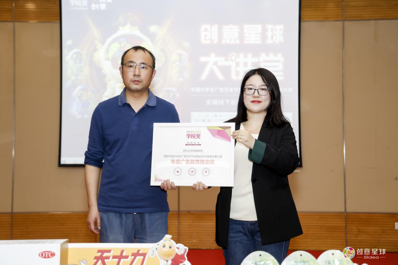 随后,学院代表接受了由学院奖组委会颁发的“年度广告教育推动奖”。苏州大学传媒学院作为国内新闻与传播教育领域较早设立高层次教育项目的学府之一,凭借其深厚的历史积淀、卓越的教育质量、丰硕的科研成果以及广泛的国际交流,已成为国内新闻与传播教育领域的重要力量,持续为行业输送高素质人才。