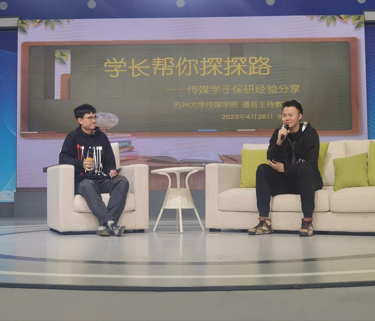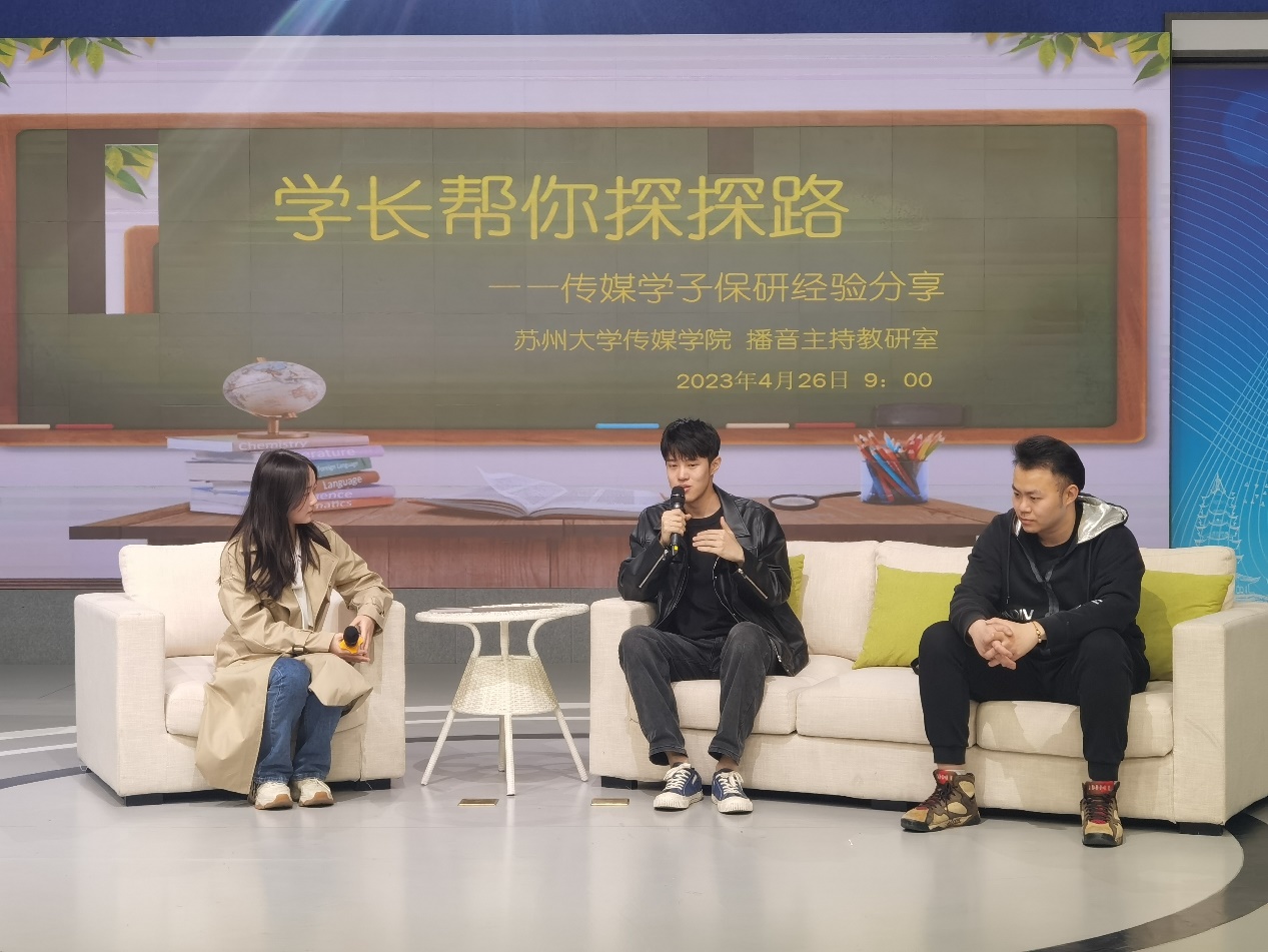 春风拂柳正杨新,鲤跃芳华恰青春。2023年4月26日上午9点,苏州大学传媒学院一楼演播厅内,2021级播音与主持艺术专业的学生正在上一堂特殊的节目主持艺术专业课。两位成功保研的播音专业毕业生薛钧元和王子涵为同学们分享了保研的经验。苏州大学传媒学院播音主持艺术教研室主任冯洋老师和许静波老师也参加了本次活动。