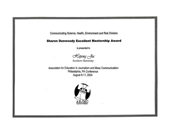 近日,在美国费城举办的美国新闻与大众传播教育学会(AEJMC)2024年会上,传媒学院贾鹤鹏教授荣获了2024年Sharon Dunwoody杰出导师奖(Dunwoody Excellent Mentorship Award),该奖项由AEJMC科学、健康、环境及风险传播(ComSHER)分会颁发,以表彰在科学传播领域展现卓越导师精神的教育工作者。