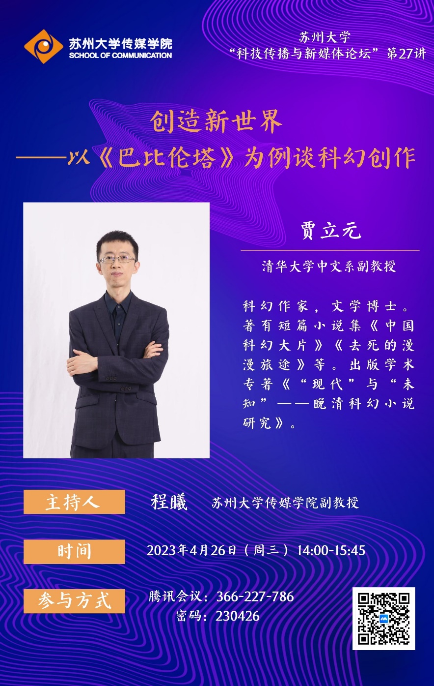 4月26日下午,应苏州大学科技传播团队的邀请,清华大学中文系副教授、科幻作家、文学博士贾立元做客苏州大学“科技传播与新媒体”论坛,为传媒学院师生带来了题为“创造新世界——以《巴比伦塔》为例谈科幻创作”的精彩报告。