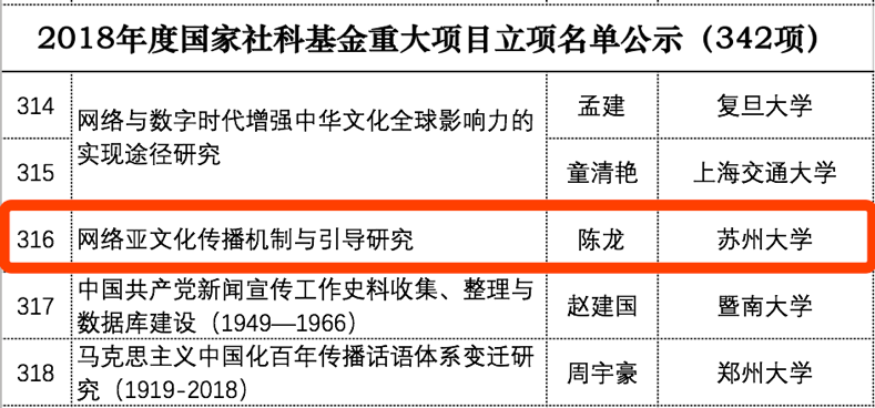 2018年10月,全国哲学社会科学工作办公室公布“2018年度国家社科基金重大项目立项名单”,共有306个项目入选。其中,苏州大学传媒学院陈龙院长申报的“网络亚文化传播机制与引导研究”成功获准立项,彰显了我院学术科研能力与竞争力方面的巨大优势,实现了传媒学院国家级重大项目申报的跨越式发展。