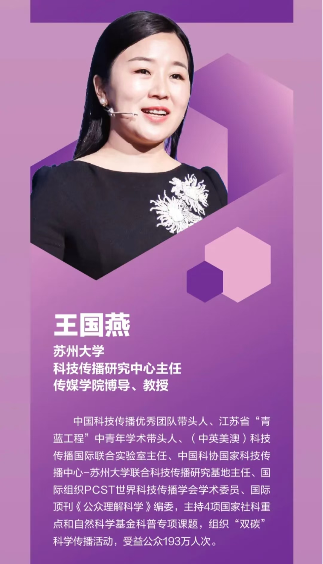 作为国内外科技传播领域的知名专家,王国燕先后主持4项国家社科基金和自然科学基金,在国内外高水平学术期刊上发表70余篇论文,协助诺贝尔奖获得者、两院院士等科学家在《自然》、《科学》等顶刊发表的120项前沿成果设计封面艺术并登上中央电视台做科普演讲。组织开展了多场国际和全国科技传播学术会议,搭建了科技传播领域的国际国内学术交流平台。2024年10月17-19日刚组织落幕的PCST世界科技传播学会苏州国际论坛,共有来自全球26个国家的近300位学者与专家参会交流,为中国与国际科学传播界的对话作出重要贡献。此外,王国燕教授还积极参与科普实践,主持多项国家级科普活动专项课题,受益公众超过200万人,并创办《科技传播研究汇》学术公众号,服务于全国的科技传播理论与实践研究者。