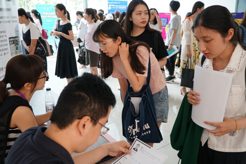 下午2点,招聘会正式开始。除了参加动员大会的全体2019届毕业生,传媒学院有实习意向的2016级、2017级本科生以及相关年级的研究生也纷纷来到文综楼1001大厅。粗略统计有超过300名学生前来求职,现场摩肩接踵,十分热闹。每个招聘方的桌子上都堆起了一沓厚厚的求职简历,同学们排队有序、面带自信,满怀鸿鹄之志。