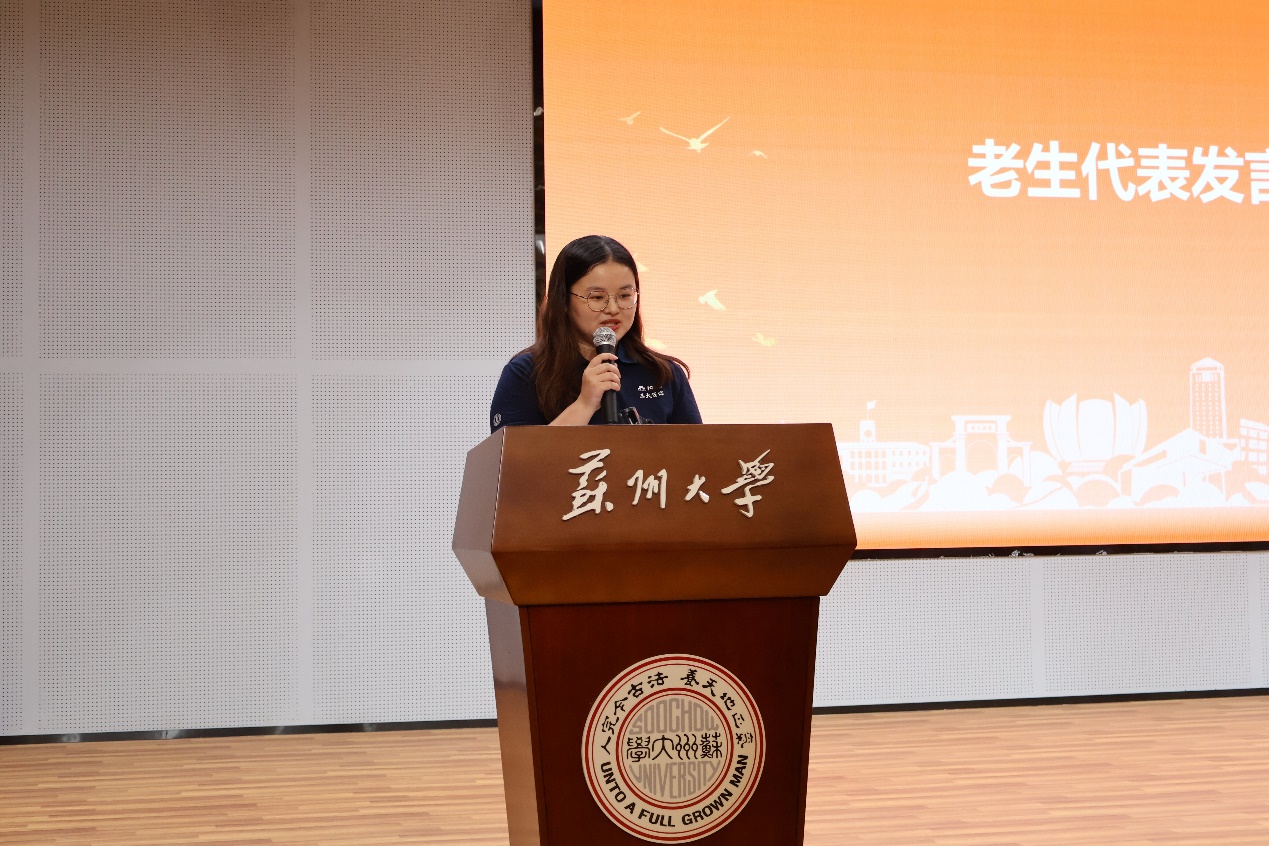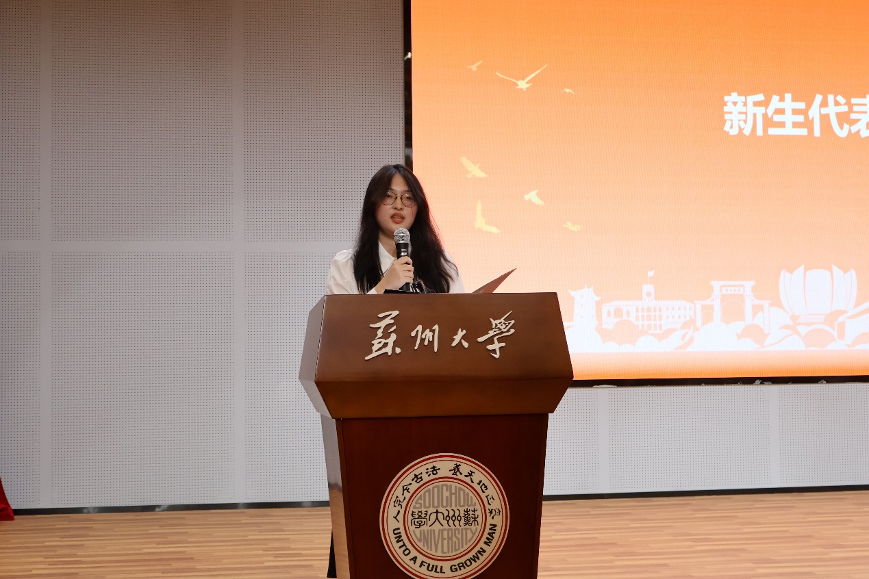 2025级网络与新媒体专业毛心悦同学代表全体新生发言。她讲述了对苏大的初印象,以及自己对传媒和传媒人素养的理解。她号召同学们始终铭记“养天地正气,法古今完人”校训,以梦为帆、以笔为桨,在广阔的传媒海洋中乘风破浪,用智慧与热情记录伟大时代,为实现中华民族伟大复兴贡献传媒人的力量。