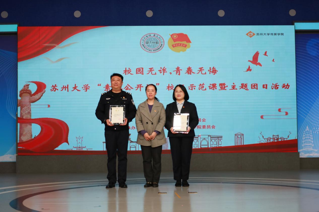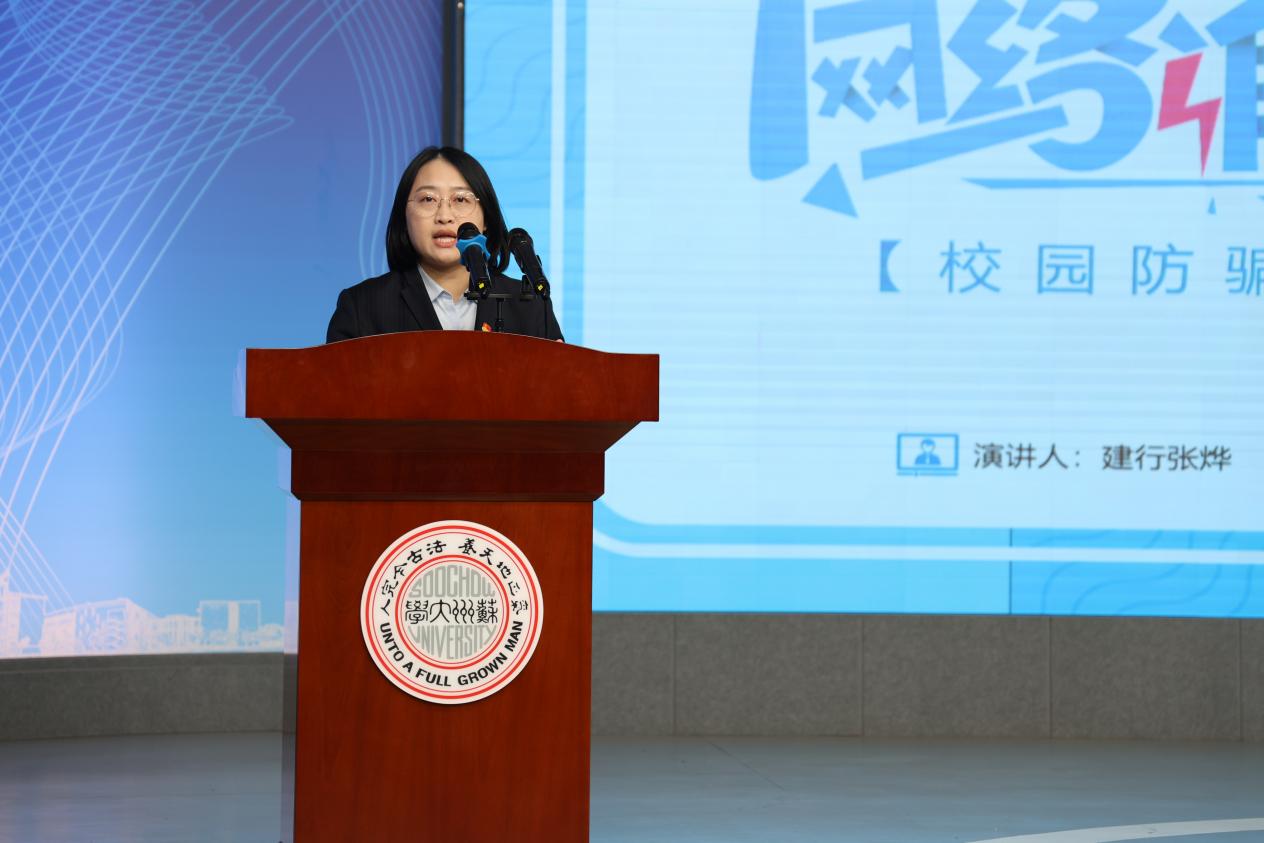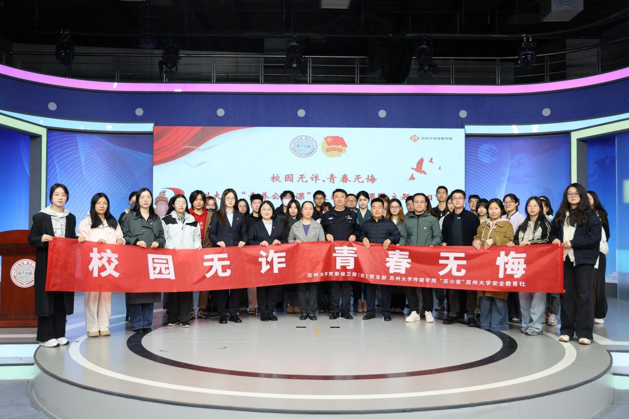 为深入学习贯彻习近平新时代中国特色社会主义思想和党的二十大精神,进一步增强师生防范电信诈骗意识,提高识骗防骗能力,建设更高水平的平安校园,11月20日下午,校园无诈,青春无悔——苏州大学“素养公开课”校级示范课在独墅湖校区传媒学院大演播厅顺利举行。苏州工业园区公安分局永安桥派出所副所长张彦,建设银行胜浦支行副行长张烨,客户经理牟宗昕,苏州大学传媒学院党委副书记、副院长丁姗,团委书记王雁冰出席活动,2024年苏州大学“青年马克思主义者培养工程”秋季班学员、传媒学院“青年马克思主义者培养工程”学员等参加活动。