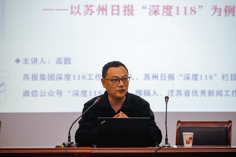 11月11日下午3点,深度报道的“四力”及深度报道的新媒体表达专题讲座在传媒学院5148报告厅举行。苏报集团深度118工作室负责人,苏州日报“深度118”栏目撰稿人,微信公众号“深度118” 编辑、撰稿人高戬老师莅临我院,就“深度报道”的主题为我院学生带来了一场精彩纷呈的讲座,讲座由学院广播电视系副教授王玉明老师主持。