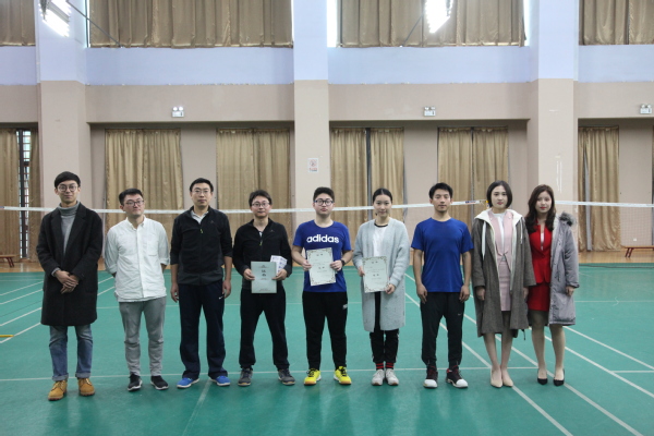 紧接着,乒乓球与羽毛球比赛在公体楼内也开始热火朝天地进行。球网两端,一方施展犀利进攻打法,一方四平八稳紧紧防守,双方都竭尽所能,各显神通。场上选手挥汗如雨,场外观众呼声不断。经过一个上午的激烈角逐,何泽谕同学和杜志红老师分获男子乒乓球冠、亚军,女子冠、亚军则归属唐庆华老师和曾楠同学;龚义明同学获得男子羽毛球冠军,程粟老师获得亚军,女子羽毛球的冠亚军获得者分别是徐欣然同学和李小椒同学;由于天公不作美,临时下起了大雨,两支进入决赛的篮球队的巅峰对决只能延期进行,相信经过充分休息的两支队伍届时会有更精彩的表现。