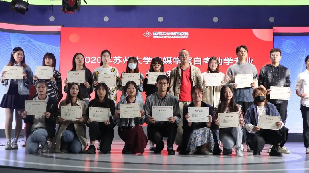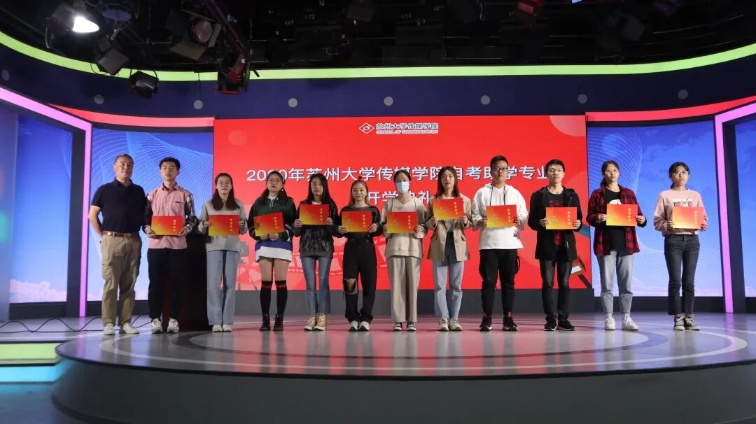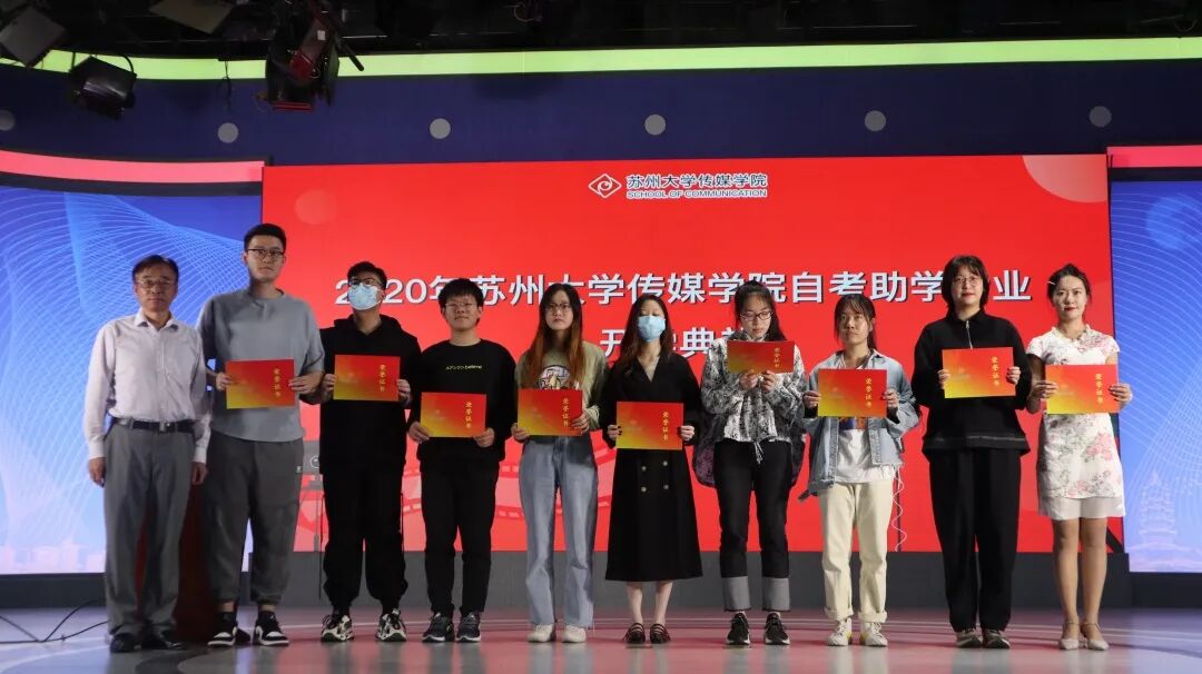 继续教育办公室主任朱志仁老师宣读传媒学院2019——2020学年度自考助学奖学金、优秀学生干部表彰名单。传媒学院继续教育办公室李晓蕾老师、广告系龚明辉老师、继续教育学院招生与管理科张震老师和传媒学院党委书记宁正法分别为获奖学生颁发荣誉证书并合影留念。