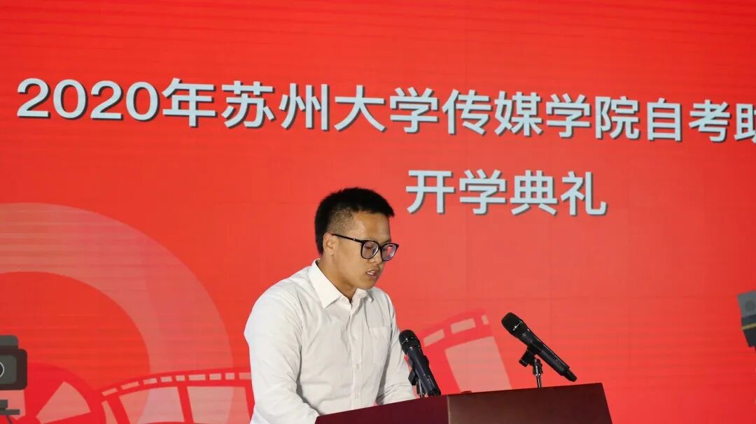 10月14日下午,苏州大学传媒学院自考助学2020级新生开学典礼在传媒学院大演播厅举行。传媒学院党委书记宁正法、苏州大学保卫处独墅湖校区治安科科长芈志坚、继续教育学院招生与管理科张震老师、传媒学院继续教育办的全体老师、班主任及学生代表出席典礼,会议由苏州大学传媒学院副院长徐冉主持。
