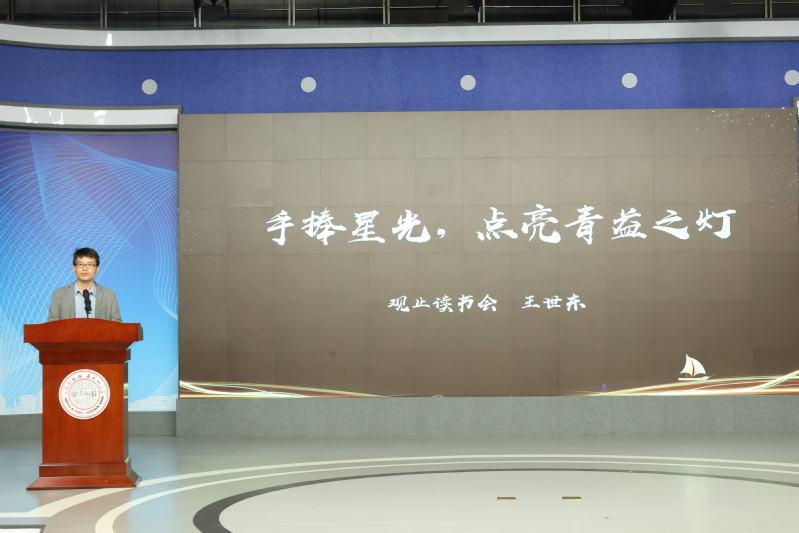 王世东老师为同学们作题为《手捧星光,点亮青益之灯》专题讲座。王老师既是一名作家、文史专家,撰写过众多著作,同时更是一位知名阅读推广人,曾获得清华大学出版社“2021年度优秀阅读推广人”等众多荣誉。王老师结合自身经历详细介绍了观止读书会会名的由来以及创办读书会背后的故事。同时,他通过“兴趣“”热情“”自信”三个词语分享了他的志愿服务经验,激励同学们要勇敢追逐自己的理想,积极参与志愿活动,在奉献他人、服务社会中展现青春亮丽的色彩。