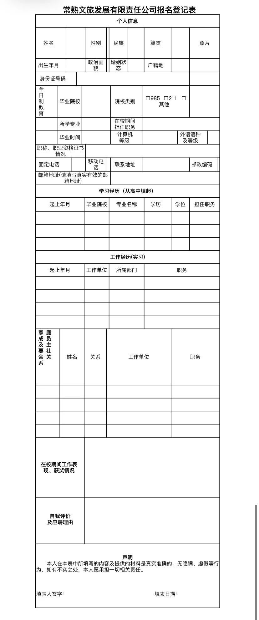 1.应聘学生填写《常熟文旅发展有限责任公司报名登记表》,同时提供个人身份证、学生证、荣誉证书等有效证件扫描件、所在院校毕业生就业主管部门出具的《毕业生双向选择就业推荐表》以及一份自传材料,并以电子邮件的形式报送,邮件主题格式为:姓名+应聘岗位。