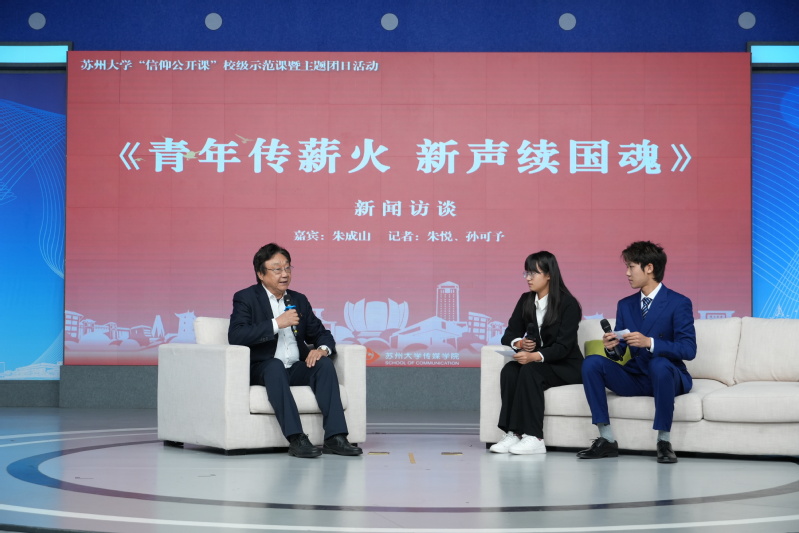 在新闻访谈环节中,朱悦和孙可予两位同学与朱成山老师展开以“青年传薪火,新声续国魂”为主题的访谈交流。以救亡历史为脉络,聚焦传媒青年的时代使命,朱成山老师结合自身担任馆长的实践与思考,阐释了南京作为抗战历史重要见证地所承载的民族记忆与精神内涵。他强调,沉重历史题材需要以史实为基,把握真实与艺术的分寸,避免过度煽情或戏说。