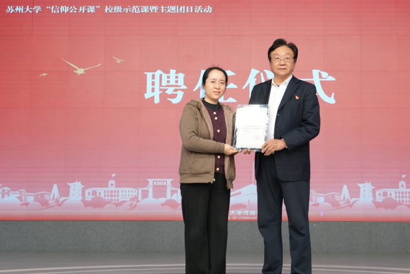 首先,丁姗为朱成山颁发苏州大学传媒学院本科生成长陪伴德政导师聘书并合影留念。