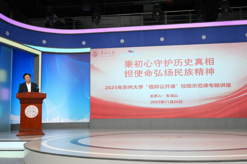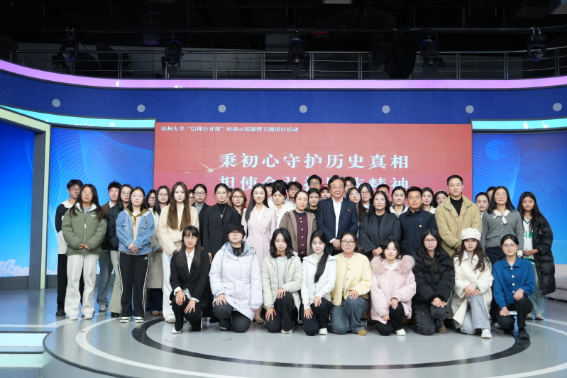11月26日下午,“秉初心守护历史真相,担使命弘扬民族精神”苏州大学“信仰公开课”校级示范课暨主题团日活动在独墅湖校区传媒学院大演播厅顺利举行。全国馆校合作联盟秘书长、常州大学红色文化研究院院长兼首席专家、全国道德模范提名奖、全国五一劳动奖章获得者朱成山,传媒学院党委副书记、副院长丁姗,学工办主任宋智,团委书记王雁冰,学工办副主任朱飞,2025年苏州大学“青年马克思主义者培养工程”秋季班学员、传媒学院“青年马克思主义者培养工程”学员以及团员代表出席活动。