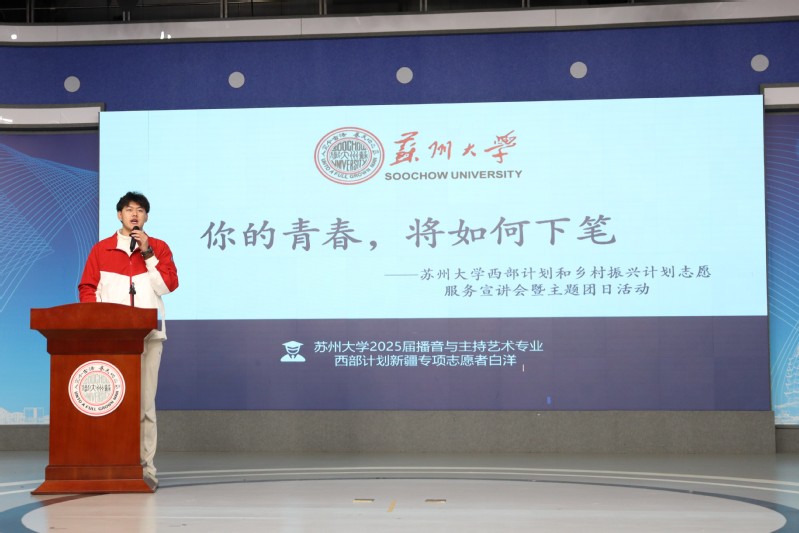 苏州大学传媒学院2025届播音与主持艺术专业毕业生、现服务于新疆乌鲁木齐的西部计划志愿者白洋,以“你的青春,将如何下笔?”为题,分享了在疆服务的深刻体会。他动情回忆起两次见到习近平总书记的珍贵时刻,讲述了那份温暖与鼓舞如何转化为坚定前行的力量,并结合在新疆的实践体会,阐释了自身对“辞家千里又千里,务必争气再争气”的理解,展现了新时代青年在远方扎根奋斗的志气与决心。