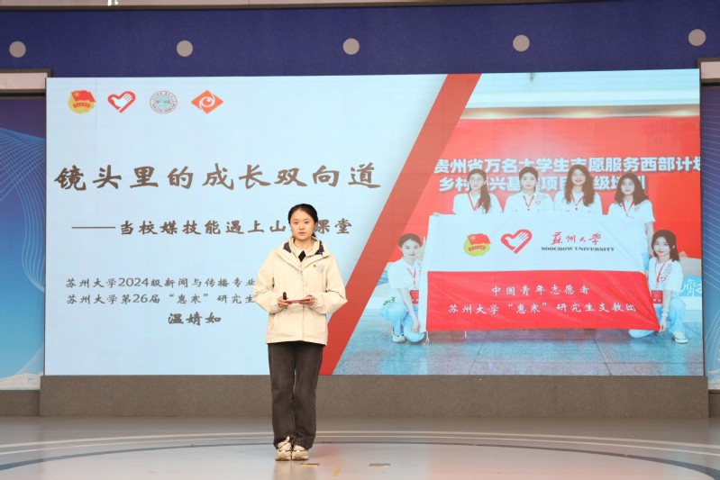 苏州大学2024级新闻与传播专业硕士研究生、第26届“惠寒”研究生支教团贵州分队队员、宣传委员温婧如,以“镜头里的成长双向道”为切入点,分享了她在支教期间如何运用专业所长,为山区孩子开设媒介素养课程,帮助他们理性面对网络世界。她从电影案例入手,生动引导学生理解“在网上说话要负责”的意义,并将学生工作中学到的新媒体运营“懂用户”的思维灵活转化为教育中“懂孩子”的一把钥匙。