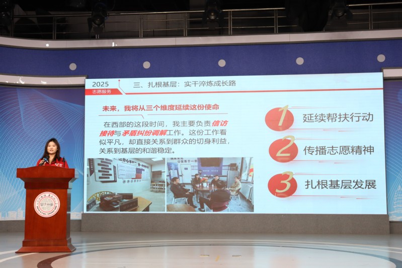 宣讲环节,五位宣讲团成员依次登台,结合自身经历,分享了自己参与基层服务项目的动人故事和心得感悟。
