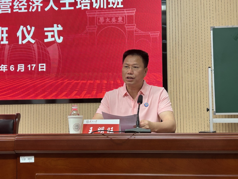 6月17日,2025年全国茂名商协会会长暨年轻一代民营经济人士培训班在我校顺利开班。来自茂名市委统战部、各商会会长等60余位学员参加了本次培训。茂名市委统战部副部长、工商联党组书记李庆川,广东省总商会副会长、茂名市工商联主席、总商会会长、欣旺达电子股份有限公司创始人、欣旺达动力科技股份有限公司董事长王明旺,苏州大学管理培训学院副院长黄艳凤出席了开班仪式。