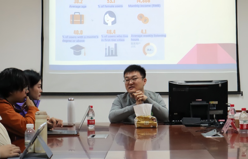 上午第一场讲座,黄磊以《一个“复古”媒介的复兴:中国播客的ABCD》为主题,从播客的定义、兴起的背景出发,结合自身实践经历,用幽默风趣的语言从受众(auidience) 、商业模式(business model) 、内容 (content) 和数字平台 (digital platform) 四个方面介绍播客在中国的发展。基于在教学中的播客制作实践以及对上海一家播客公司justpod的参与式观察,黄磊从受众媒介记忆、传媒机构逻辑和媒介生态发展的视角,分析促成播客这一“复古”媒介在中国兴起的微观、中观与宏观因素,探讨中国播客发展过程中出现的问题,展望中国播客的未来发展。在互动环节中,同学们提出了“博客能否促进企业社会责任的实践?”“付费博客节目越来越多,是否会成为一种趋势?”“播客的变现模式有哪些?是否值得模仿?”等问题,黄磊针对同学们的提问一一进行了细致的解答。