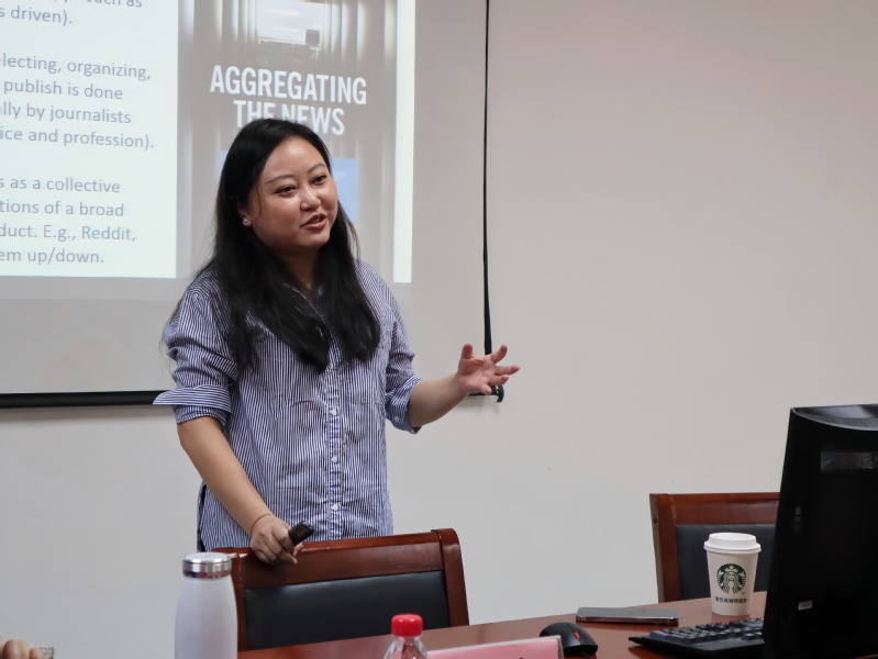 接着王丹以《聚合类新闻实践:中西经验对比》为主题进行了分享,展示了她在SSCI期刊Journalism上发表的关于聚合类新闻的论文“Making Un-news”的写作心得。王丹解释道“Un-news”是中国新闻编辑室的行话,指的是聚合的过程和产物。它概括了数字新闻和传统新闻之间的冲突,媒体行业技术带来的挑战和应对措施。王丹表示:与西方的聚合新闻生产机制不同,由于中国充满活力的传统媒体环境,二手新闻人(又称“数字聚合器”)制造出来的“新闻”往往被主流权威认为是“非新闻”,这些数字聚合器必须在当地中国媒体的传统印刷记者和编辑的管理下工作。王丹对比传统媒体与数字化媒体的新闻生产实践,基于自己对一家新媒体新闻生产机构的田野化调查,理论与实践相结合,讨论媒体系统和社会结构对新闻生产的影响。