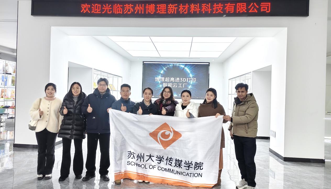 1月29日下午,受苏州纳米技术与纳米仿生研究所邀请,苏州大学传媒学院师生一行赴苏州博理新材料科技有限公司参观交流。双方围绕高速增材制造技术应用、文创产品开发与校企合作路径等开展实地走访与座谈对接。传媒学院党委副书记、副院长丁姗,数字传播系系主任王国燕教授,团委书记王雁冰,以及程曦、林瀚等学院多名老师和硕博研究生共同前往调研交流。苏大出版社社长张健等一同应公司邀请参与了交流。