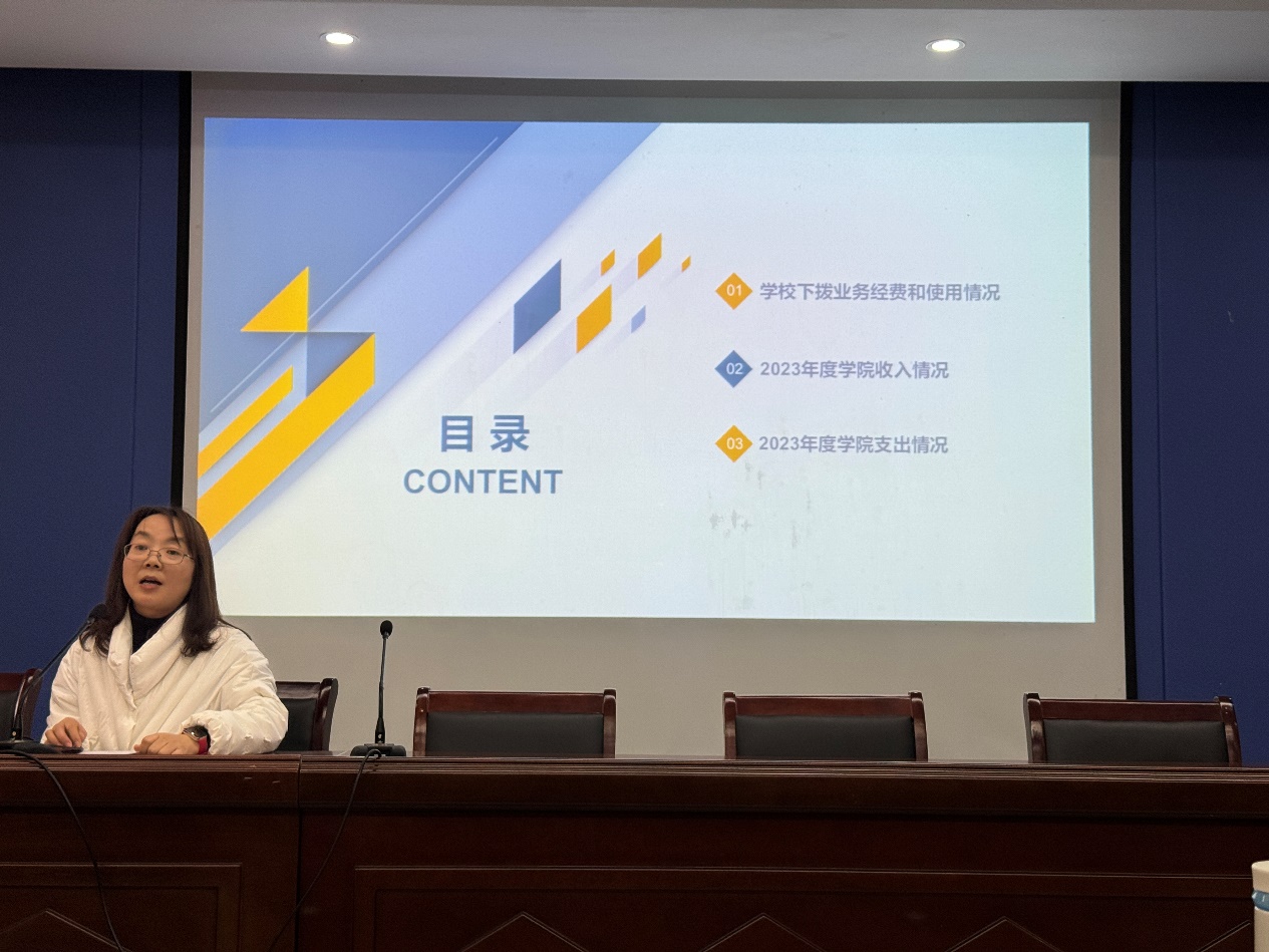 副院长黄艳凤从学校下拨业务经费和使用情况、2023年度学院收入情况、2023年度学院支出情况等三个方面,向大会作了学院财务报告。