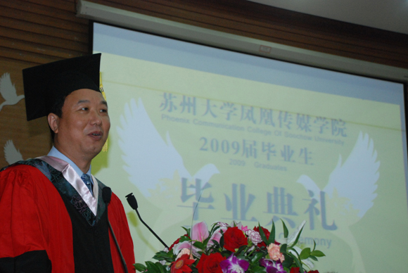 6月28日下午2:00,凤凰传媒学院2009届毕业生毕业典礼暨学位授予仪式在独墅湖行政中心综合楼一楼报告厅隆重举行。学院院长王尧、党委书记赵阳、执行院长杨桦、副院长陈龙、副院长徐国源、调研员王苏光、党委副书记常青伟,教师代表倪祥保、陈霖、黄震、马中红、杨新敏及班主任代表黄晓辉出席典礼仪式。2009届全体毕业研究生、本科生及部分学生家长和在校学生代表参加了典礼。毕业典礼由学院党委书记赵阳主持。