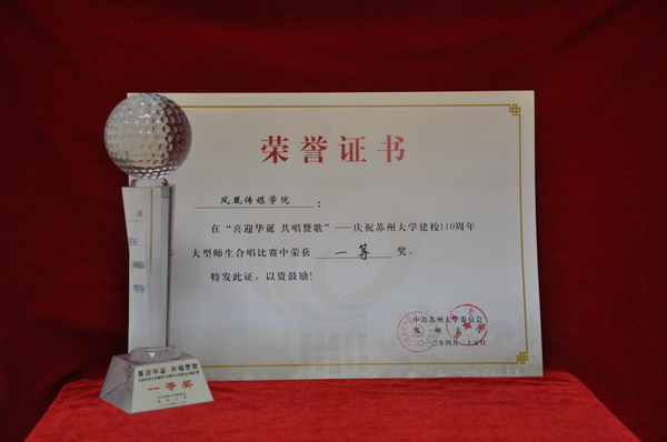为庆祝苏州大学建校110周年,在师生中积极宣传校庆的宗旨与意义以及苏大的优良传统,充分展现全校师生风采,表达身为苏大人的自豪与喜悦之情, 苏州大学展开了“喜迎华诞 共唱赞歌”——迎接苏州大学110周年校庆大型师生合唱比赛。当比赛通知下达到凤凰传媒学院,学院就展开了一系列精心的筹备工作。学院领导、老师予以此次比赛高度重视,学院各学生组织主动承担起比赛的组织与排练工作,全院师生齐心协力同唱苏大110周年校庆献礼之曲,并最终捧回了合唱比赛的一等奖。
