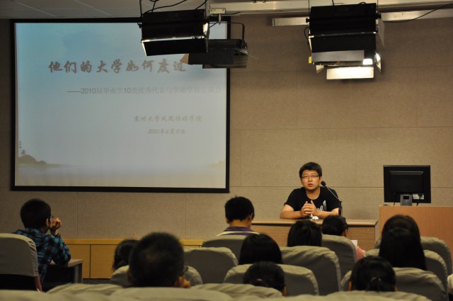 作为社会实践类代表的谢苏同学谦虚地自称是“平民代表”,其积极、乐观的精神风貌及通过多种实践活动提高自身综合能力的不懈努力,给同学们留下了深刻的印象;作为保研类代表的夏嬖群同学和大家一起回顾了自己大学四年学习、工作和生活的历程,诚恳地提醒学弟学妹们在各个年级阶段应该注意的一些方面;作为竞赛类代表的李欣临同学以幽默风趣的话语,讲述了自己参加全国广告大赛的经历,并给学弟学妹们今后参赛提出了几点针对性的建议;作为考研类代表的陈稳同学,结合自己复习考研的亲身经历,辅导学弟学妹们应如何明确考研目标,如何进行英语、政治和专业课复习;作为公务员考试类代表的汪亮亮同学和大家分享了自己富有传奇性的考公务员经历,他还真诚告诫同学们平时要多关注相关信息并注重深入思考;作为就业类代表的荣荣同学,结合自己丰富的求职经历精心准备了PPT,给同学们讲述了自己在求职过程中的众多感悟,并给大家提出了很多中肯的建议;作为西部志愿者代表的张佳一同学在讲述自己大学四年中“积极行动”的具体经历的同时,重点介绍了自己服务西部建设的心路历程;作为出国代表的韩晓乐同学详细讲述了自己申请出国的过程经历,并热情地将自己的个人邮箱告诉大家,以方便学弟学妹随时交流;作为兼具科研、社会工作和志愿者活动类特征的代表,征鹏同学通过精心准备的PPT,结合自己丰富的个人经历,就学习、实践、交际、影响力、兼职等多个关键词,与学弟学妹进行了题为《大学生活的策划》的交流。