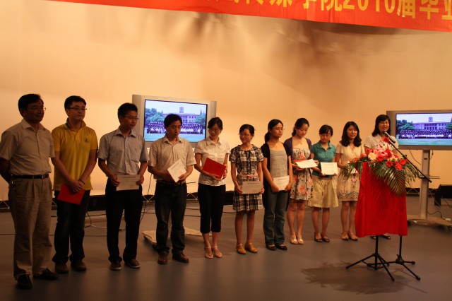 毕业典礼的最后,毕业生同学向母院赠送了纪念品,领导、老师们为学校和学院优秀毕业生颁发了荣誉证书并合影留念。至此,毕业典礼正式结束。然而,很多毕业生都没有离去,大家一起坐在演播厅里看着各班精心准备的校园点滴视频展示,一起怀念那些曾经共同度过的美好时光。