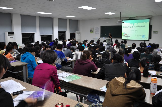 众所周知,新东方老师一向以风趣生动的授课风格受到广大同学的青睐,再加上四六级考试临近,更使得同学们对这场讲座的兴趣急剧增加。讲座开始前,会场早早便已挤满了热情高涨的听众。