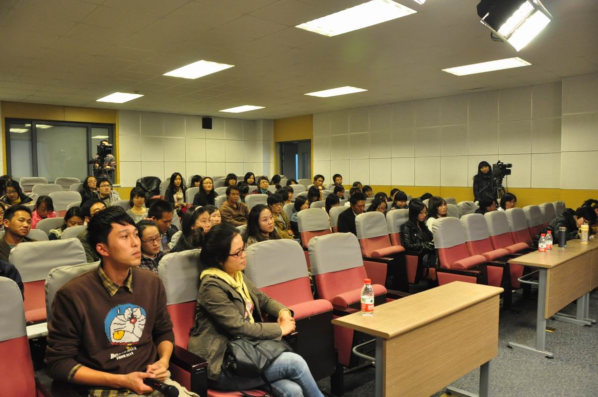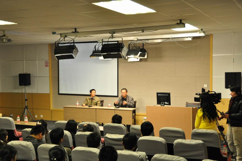 影片放映结束后,特邀嘉宾陈霖和曾一果两位老师被邀请到嘉宾席就坐,与同学们一起热烈讨论起来。陈霖老师作为该片的文学指导,首先讲起了影片的幕后故事。导演周亚平在2008年就开始了该片的创作,并在第一时间邀请陈霖老师为其撰写文字稿,提供专业意见。在摄制过程中,陈老师坦言他们遇到了不少困难,如在撰写稿件之初,面对完全没有音效只有画面的影片,很难找到创作的灵感,只能通过其他方式来构思文字。