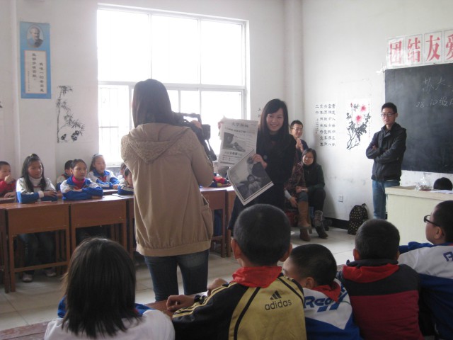 支部党员代表还向民工子弟学校的同学们介绍了新闻、广告、广电等与传媒专业相关的简单知识,并耐心地回答了小朋友们积极的提问。新闻专业的党员代表向同学们展示了学院《大学新闻》报纸,并向他们讲述了报纸制作发行的全过程;广告专业的党员代表则教同学们自己动手制作简单富有创意的广告作品;广电专业的党员代表则教东方学校的同学们认识了摄像机的构造和简单操作。