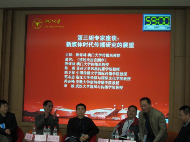 在12月4日下午的专家座谈中,陈霖教授与澳门大学的陈怀林教授、中国传媒大学的陈卫星教授、浙江大学的范志忠教授、安徽大学的芮必峰教授、武汉大学的单波教授等六位学界专家就“新媒体时代传播研究的展望”进行了探讨。当日晚上,在“新媒体时代的国际传播”分单元中,曾一果副教授宣读了《全球想象与传统的再生产——全球化语境中大众传媒的“城市叙事”》论文。