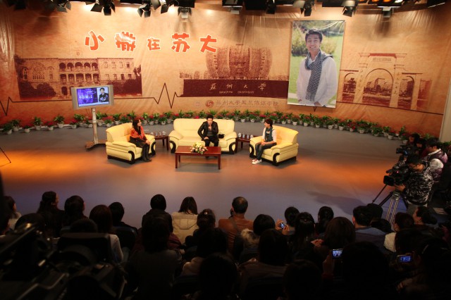 下午4点,在长达10秒钟的掌声中,撒贝宁走进演播厅,以一身休闲装扮出现在广大撒粉面前。访谈由凤凰传媒学院2007级学生富裕主持,并邀请了马忠红教授共同参与此次活动。校党委宣传部部长陈进华,凤凰传媒学院党委书记赵阳,副院长陈龙、徐国源,副书记、副院长常青伟以及《今日说法》摄制组莅临现场观看了访谈活动。