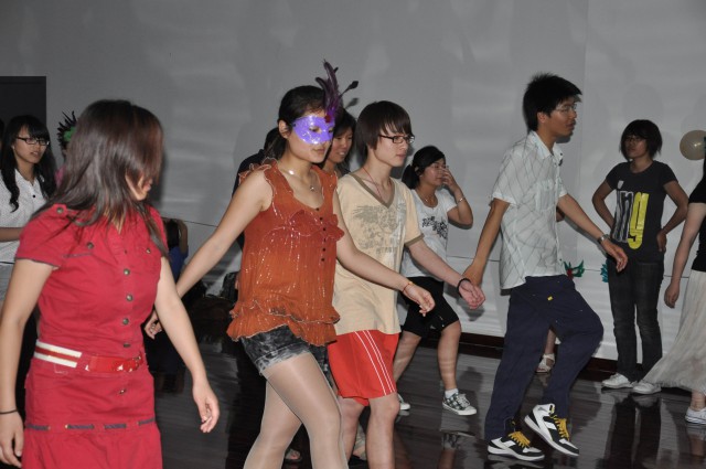 每个到场的同学手里拿着代表身份的扑克牌,戴着从墙上摘下来的假面,对于即将开始的舞会充满期待。终于,主持人以一首热情激扬的《王妃》独唱热腾了现场,随后,一首动听的女声独唱《画中仙》把大家渐渐带入了舞动的状态。为了让大家有一个前期的准备,工作人员先放了一首耳熟能详的《兔子舞》,在熟悉的音乐中,在于乐和陈希萌两位领舞的带领下,现场同学开始不由自主地加入到兔子舞的行列中,原先散在四周的同学,此时此刻已经成了一条长长的队伍,随着音乐一起舞动。一曲兔子舞过后,一首又一首劲爆的动感舞曲点爆了现场,在领舞的带领下,大家渐渐脱去刚开始时的羞涩,跟随着领舞的舞步,在音乐中翩翩起舞。由于很多人是第一次尝试跳这类集体舞,开始时很多人都无法跟上音乐的节拍。于是,作为领舞的陈希萌就先让音乐停下来,一步一步地现场教大家怎么跳。明白舞步中的规律后,大家的热情更加高涨,跳舞的队伍也越来越壮大。