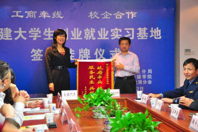 为了表达对沧浪工商分局的感谢,赵阳书记代表苏州大学凤凰传媒学院向沧浪区工商分局赠送了锦旗。整个签约授牌仪式结束后,政府、企业、学校的代表们还进行了轻松而热烈的座谈。