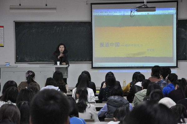 李宇宏老师首先和大家分享了自己从事媒体工作十几年的经历和感悟,给同学们的职业规划作出了指导。李老师早年留学日本和美国,学习社会学和工商管理学,对于传媒并没有系统地进行学习,但她说因为做记者可以更多地了解社会,接触不同的社会层次,所以选择这份职业,直至今日,她最引以为豪的身份还是记者。在央视《东方时空》工作的五年里,与白岩松、敬一丹、水均益等同事的合作,使得非传媒专业毕业的李宇宏很快进入了记者的角色,她做过许多专访,内容涉及人物、环境、经济、政治等等。之后李宇宏老师想进行一些新的尝试,和朋友合开了一家文化传媒公司,为电视台进行策划,独立采访和制作节目,在此过程中感受到作为媒体人的成就感。在谈及媒体人的职业时,李老师深有感触地说:“做记者最重要的是要独立思考、客观报道,不断探索、发现、认知。”她在香港城市大学教授《媒体写作》课时,对学生们最大的要求就是有独特的想法,比如让学生写人物特写,她希望40个学生笔下有40个不同的乔布斯。李老师自己在进行媒体实践时也很注重这点,在著作《耶鲁的青春岁月》中就是采访了21个耶鲁大学的学生,在此过程中思维的深度也得到提升。