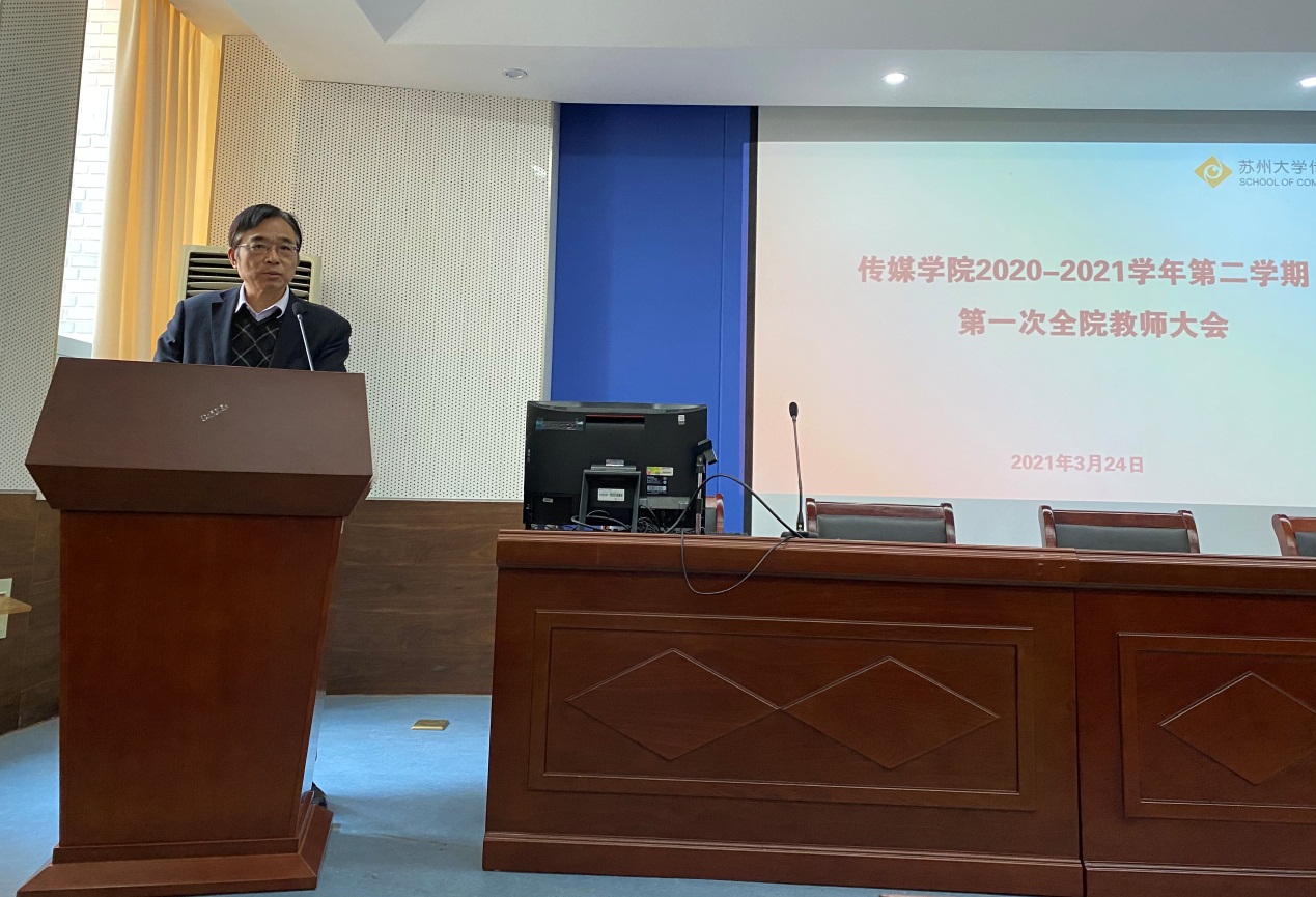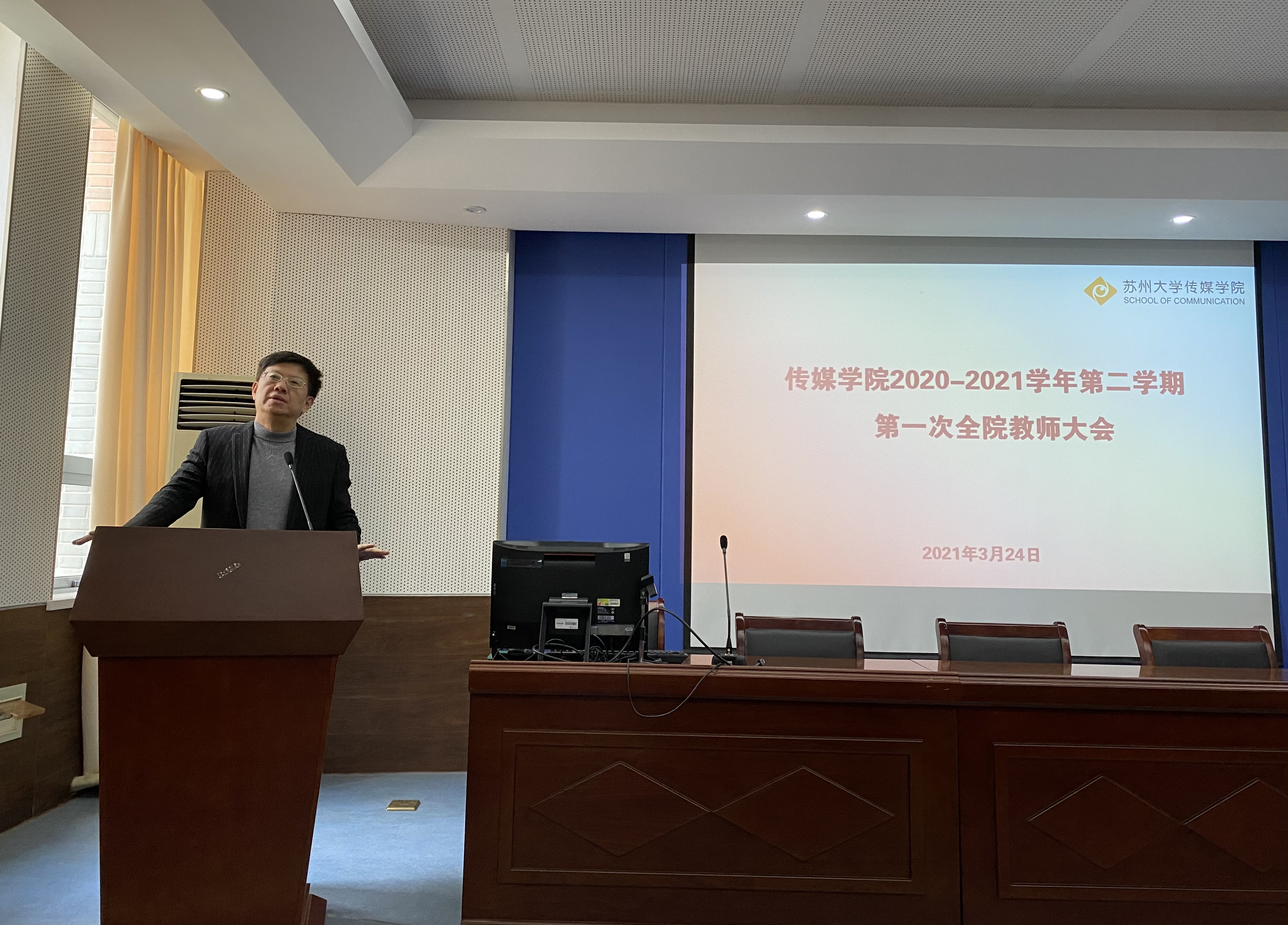 2021年3月24日下午,传媒学院在1005幢5148报告厅召开本学期第一次全体教师大会,大会由传媒学院党委书记宁正法主持。