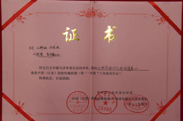 近日,我院《大学新闻》社在“2012中国(江苏)高校传媒联盟年会”上荣获“十佳校园媒体”的光荣称号,汪可、王舒娅、冯晓晓、刘钦瑶、李向南的《如何面对夭折的青春》及刘振远、沈雪婷的《最后的全程见证者——访东吴老校友高文彬》两篇报道荣获“十佳新闻作品奖”,主编刘振远斩获“最佳运营奖”。更令全社成员欣喜的是,该校园媒体官方网站将于5月4日正式上线。 中国高校传媒联盟是在共青团中央、教育部指导下,中国青年报社联合63所重点高校发起成立的高校传媒间的联谊组织,其宗旨在于为各高校的校园媒体搭建一个交流、共享、提高、互惠的合作平台。江苏高校传媒联盟于2008年11月8日成立,在共青团江苏省委、中国青年报江苏记者站的指导下开展活动,秘书处设在中国青年报江苏记者站。近年来,江苏高校媒体在各高校党委宣传部、团委等部门的指导下得到了蓬勃发展,为加强高校宣传工作、促进校园文化建设、构建和谐校园做出了卓越贡献。 《大学新闻》创刊于1998年4月,是我院学生在学院的支持下,完全自主编辑出版的一份学生报纸,以“为学生立言”为办报理念,以“打造大学生主流媒体”为目标,不断发展,不断完善,目前是我校唯一一家全国四星级校园媒体,同时也是江苏省唯一一家全国四星级报纸类校园媒体,全国仅有11家校园媒体获此殊荣。 《大学新闻》社成员与中国校媒联盟以及国内各地大高校保持了长期的交流互动关系。目前全社共有4位同学是江苏高校传媒联盟成员,先后参与了苏北大学生村官调研、上海校媒主编培训会、“常春藤”学生领袖对话中国高校传媒联盟、江苏高校传媒联盟招新宣讲会、“微社团”活动等多项活动。此次我院学生媒体《大学新闻》在2012中国(江苏)高校传媒联盟年会上所取得的这些成绩,对我校学生媒体的发展具有良好的鼓励和推动作用,对大学生独立思考、展现年轻一代的精神风貌起到积极的导向作用。