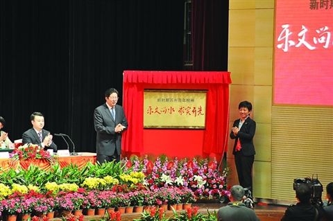 受团市委委托,研究中心的核心成员在今年4月份就围绕苏州青年精神表述开展了调查,形成了初步的建议,并在中心成立仪式当天,会同来自各地参加“新媒介新青年新文化”高峰论坛的专家学者,就苏州青年精神的表述进行了充分的讨论。在此基础上,研究中心核心成员就苏州青年精神进行了进一步文字提炼,形成了三套方案和相应的语言阐释,由苏州团市委面向全社会广泛征集意见。经反复研究和商洽,最终将“乐文尚水 求实开先” 确定为新时期苏州青年精神的正式表述。“乐文尚水、求实开先”将“新时期苏州青年精神”的内涵浓缩为八个字、四个方面、两个层次的表述。“乐文”表达的是苏州青年对文化的尊崇和热爱;“尚水”表达的是苏州青年对苏州本土文化的热爱和认同,对水的精神的秉持和传承;“求实”不同于传统意义上的“务实”,它更加强调青年主体对真理的主动追求、对现实的积极关切、对成功的价值期许;“开先”则是在“求实”的基础上面向未来的行动,它表明苏州青年的精神构成中继承传统而又突破束缚的品质。从这一意义上说,“乐文尚水”构成了苏州青年的文化底蕴和文化传承的精神特质,是苏州青年立足本土面向世界、立足当下面向未来的精神基础;而“求实开先”则强调了苏州青年的现代性、当代使命、价值取向及行为目标。该精神在11月26日召开的共青团苏州市第十八次代表大会开幕式上正式发布,省委常委、苏州市委书记蒋宏坤同志和江苏团省委书记万闻华同志共同为“新时期苏州青年精神”(由蒋宏坤书记亲笔题写)揭牌。