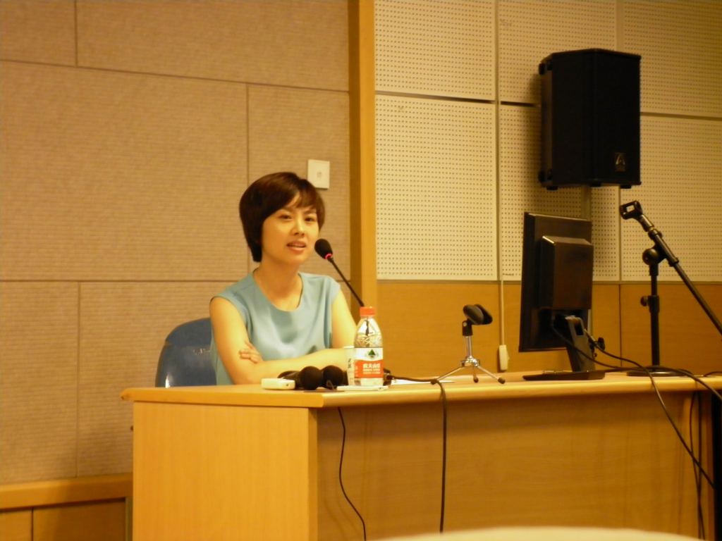 吴益丹是宁波电视界唯一一位新闻评论节目女主持人。先后独立策划主持新闻评论栏目《丹丹说网事》、《丹说无妨》。讲座一开始吴益丹便指出:“你们进来学主持,就要有明确的自我定位,知道自己想成为哪样的主持人”,当回忆起自己的主持人面试经历时,她说自己非专业出身,所以没有明显播音主持的腔调,但表现得比较亲切自然。她也鼓励大家要树立自己的风格,切莫一个腔调。