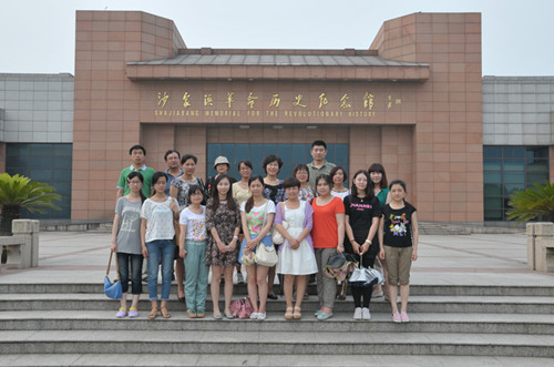 跟着导游的步伐,师生们参观全国爱国主义教育示范基地、全国百家红色旅游经典景区——沙家浜革命历史纪念馆。占地面积6400平方米,建筑总面积4492平方米,陈列了400多幅民主革命时期沙家浜的革命历史图片和一批革命文物,同时还采用了现代化多媒体景箱、场景复原、花岗岩浮雕等多种手段布展,使展览动静结合、平面立体结合、艺术和科学结合,形象逼真地再现了沙家浜军民鱼水情深,共同抗敌的感人事迹。在讲解员的带领下,大家参观了展馆内“建党及大革命时期”、“土地革命战争时期”、“抗日战争时期”、“解放战争时期”、“今日沙家浜”等历史资料。亲眼目睹了抗日军民用过的大刀、土枪、水壶,新四军的臂章,抗日印刷品《东进报》……;一件件革命遗物、一幅幅珍贵的历史照片、一个个感人肺腑的故事,谱写了沙家浜军民雨水深情、同仇敌忾的战斗篇章。