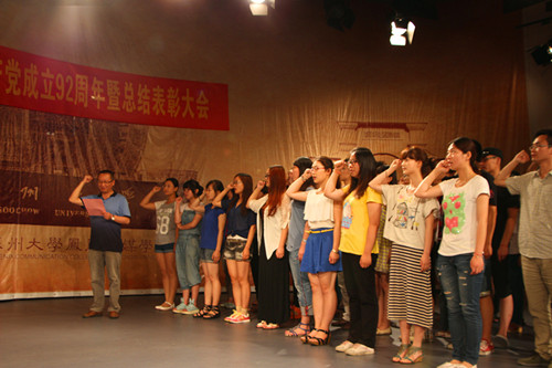 随后,学院党委书记赵阳上台发言,从深化拓展基层党建工作以及加强内涵建设、提升办学水平等方面总结了学院一年来的党建工作。通过回顾中国共产党92年的峥嵘历程,赵书记希望广大党员能更加明确自己担负的责任。在发言中,赵书记提到学院不断巩固“创先争优”成果,进一步优化了党员发展程序。去年九月,我院适时调整党支部的设置,现有五个教工党支部,七个学生党支部。在这一年中,我院通过多种形式加强了党员、入党积极分子的教育培训,本学年邀请了校党委书记王卓君等领导和专家,围绕“学习十八大精神”、“公民道德建设”以及“学习习近平总书记五四讲话”等主题开设了理论讲座。并在人人网上建立了党员在线交流平台,也建立了优秀读物传阅制度和支部书记读书会。各个党支部也纷纷开展了形式多样、内容充实的党日活动。在总结学院一年来所取得的各项成绩后,赵书记强调广大党员要自觉加强党性锻炼,提高自身的素质,强化服务意识,提高服务能力,发挥带头作用。