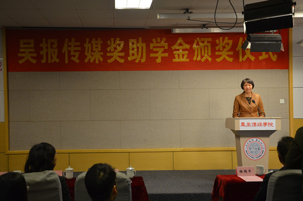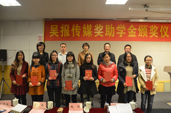 陈忠院长宣读了奖助学金学生名单,吴江区委及吴报传媒的各位领导为凤凰传媒学院35名成绩优秀的本科生和研究生颁发了荣誉证书,并合影留念。随后,2012级研究生朱艳文、2010级本科生臧玉代表奖、助学金获得者发言,两位同学都表示在今后会更加努力学习来积极回报社会,勇于进取并承担社会责任,争取成为未来优秀的传媒人。