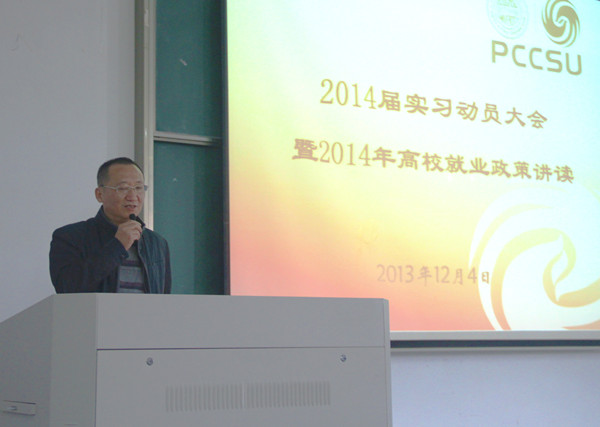 12月4日下午1点30分,凤凰传媒学院2014届实习动员大会暨2014年高校就业政策讲读在文综楼1001幢1101室举行。校招生就业处沈黔老师、院党委副书记副院长常青伟老师、新闻系主任陈霖老师、广告系主任王伟明老师、广告系胡明宇老师、教务秘书张文娟老师出席了本次会议。大会由辅导员助理王雁冰老师主持。