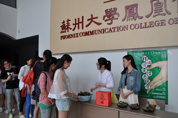 包粽结束后的义卖环节是特色活动的又一大亮点。 11、13级本科生党支部书记朱飞在收齐同学们一枚枚满怀爱心祝福的粽子后送往食堂煮熟后,摆起了“爱心义卖摊”,答辩结束的毕业生、路过的老师教工,无不循着粽香凑近摊位一探究竟,并慷慨解囊,为公益事业增添甜美味道。