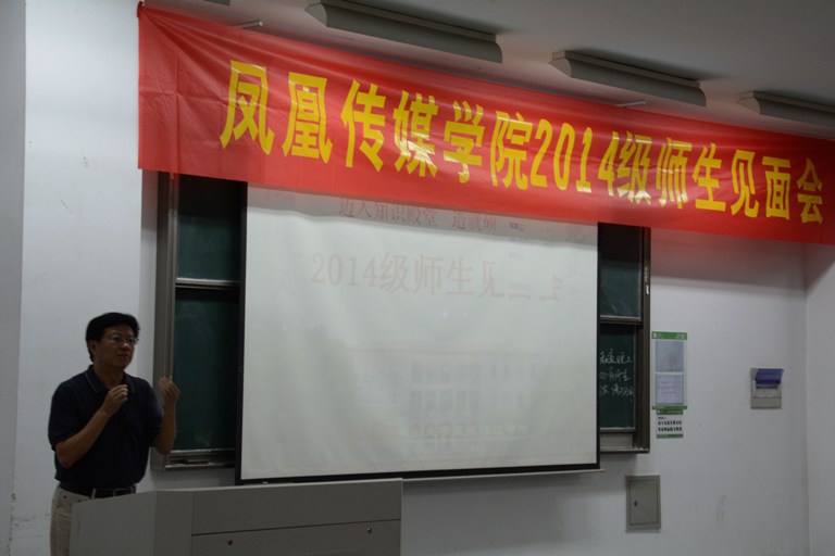 9月15日晚,室外夜幕初降,校园渐归平静,独墅湖文综楼1001幢1101室却人声鼎沸,灯火通明。苏州大学凤凰传媒学院2014级师生见面会正在此隆重举行。凤凰传媒学院院长陈龙,党委书记于毓蓝,副院长、副书记常青伟,以及凤凰传媒学院各系主任、硕士生导师、班主任等出席了见面会。会议由副院长、副书记常青伟主持。