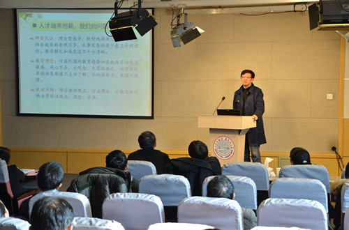 苏州大学教务部周毅部长作主旨报告,周毅部长围绕“让同学们从考生变成学生”这个核心命题,从课程建设与改革这个工作重点出发,深入阐述了人才培养的相关问题,对我校的课程体系、通识教育与专业教育的关系以及课程资源建设做了说明和总结,并且对下一步工作提出了思考。此外,周部长还特别强调了“翻转课堂”的概念,并对我院在2015年的教学工作提出了更高的要求。